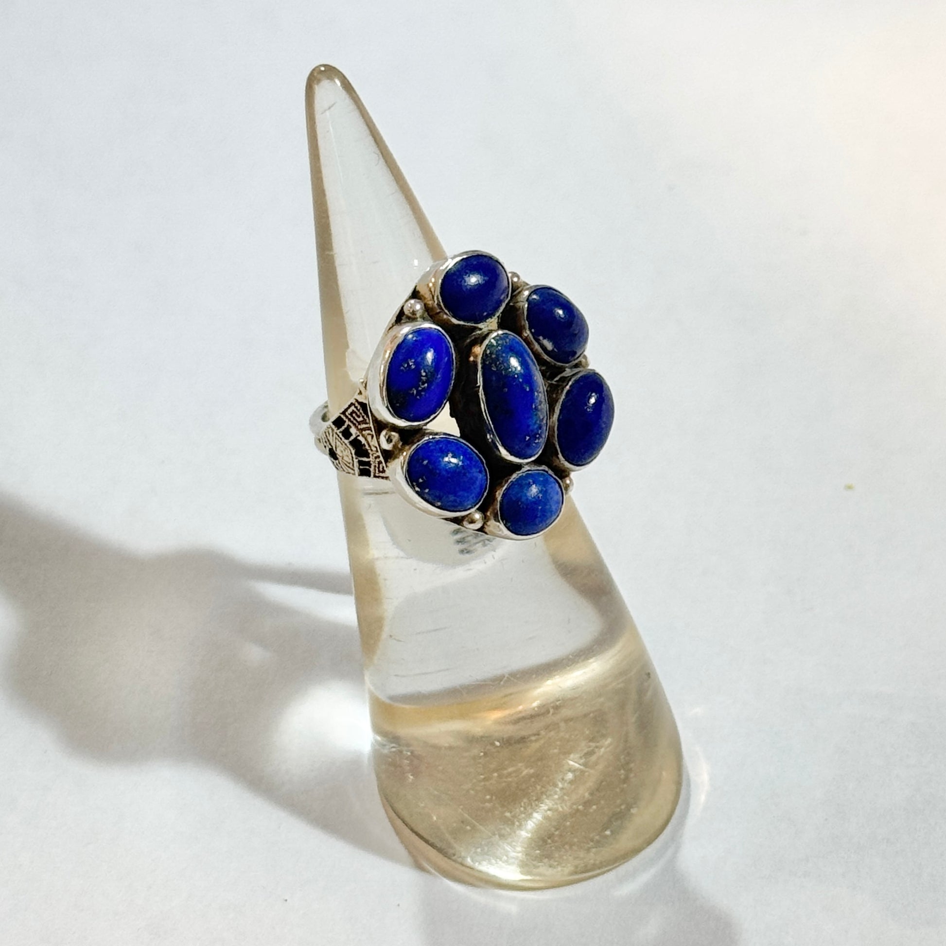 Seven oval lapis lazuli cabochon ring set in etched sterling silver; vintage.