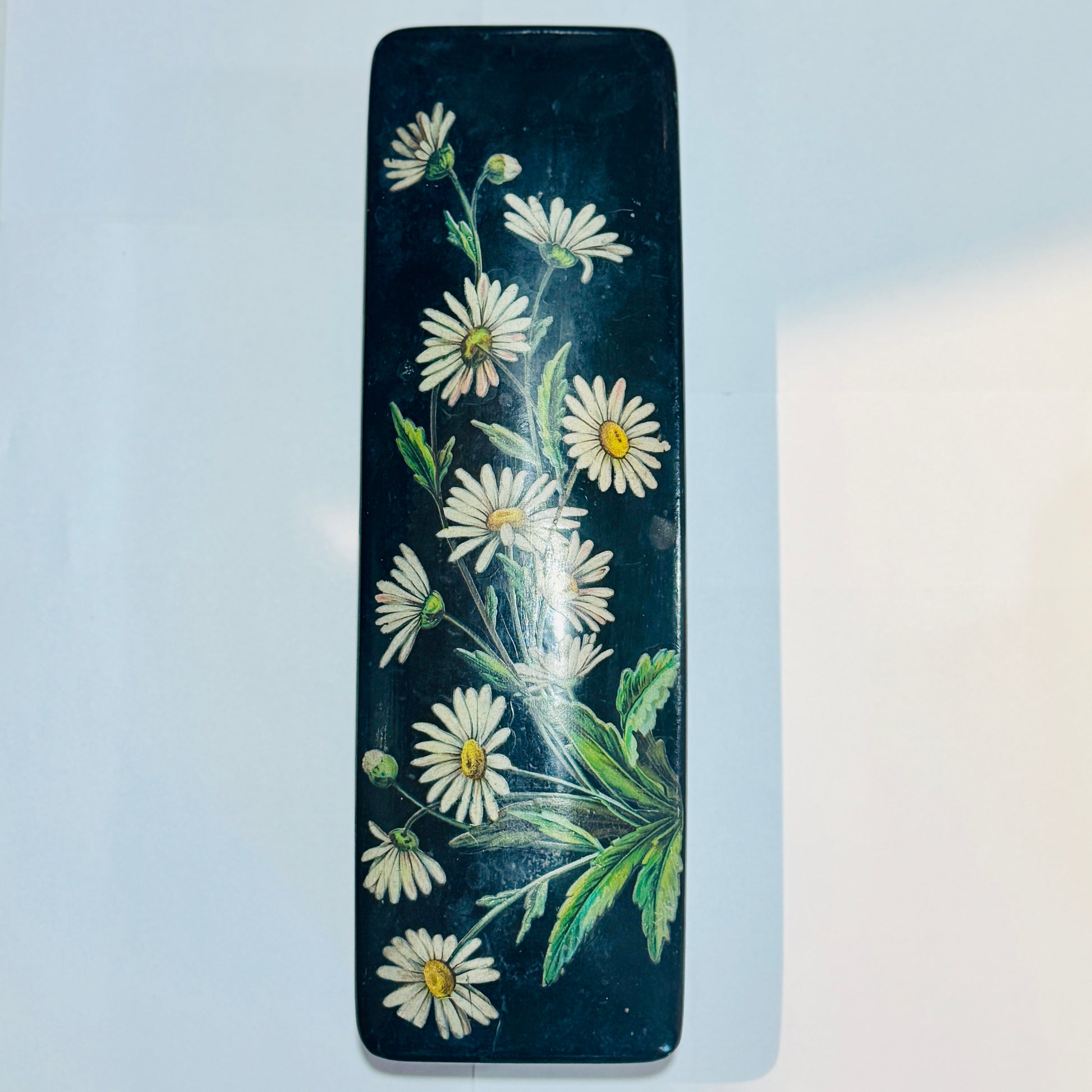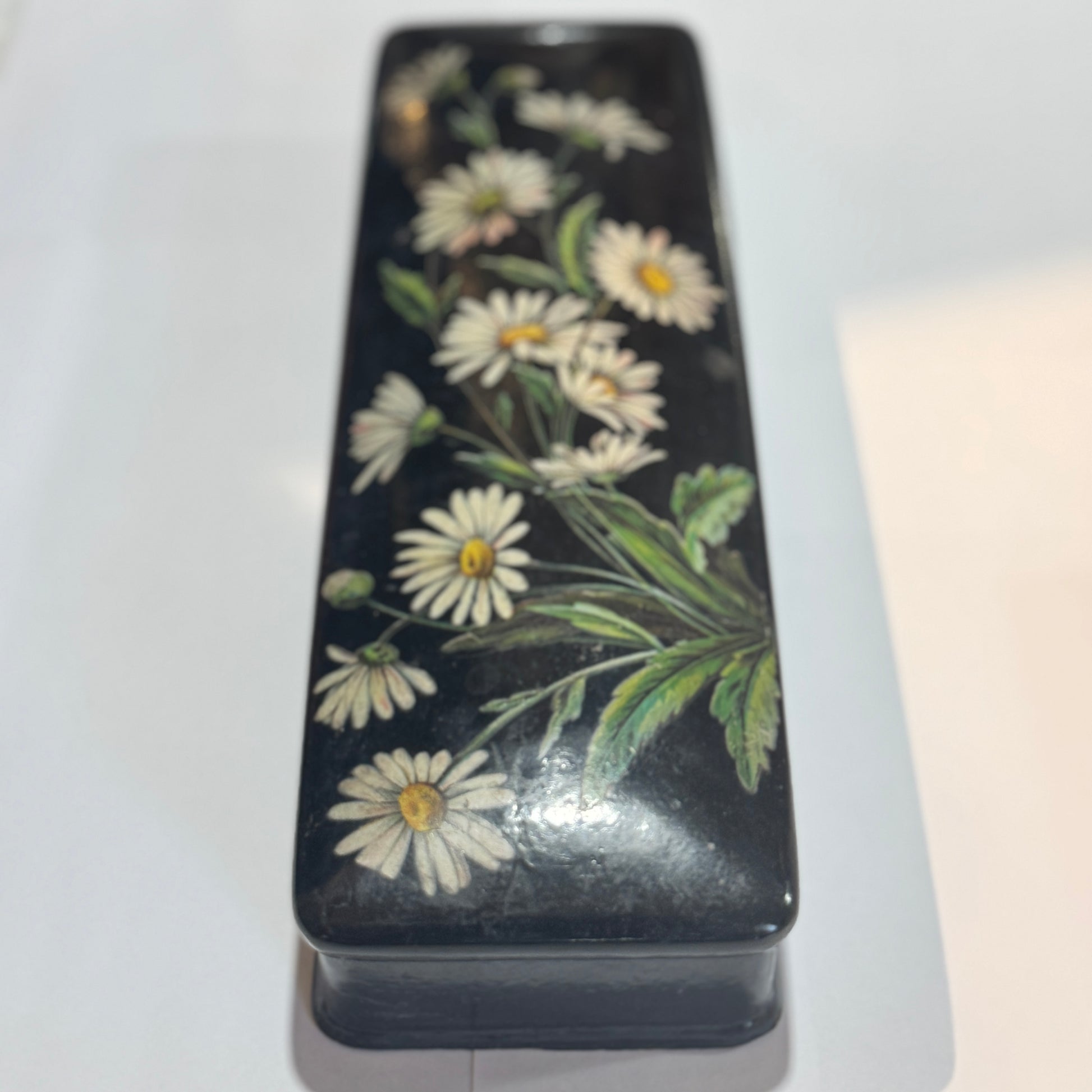 Rectangular box with lid; lid has decoupaged daisies on the top.