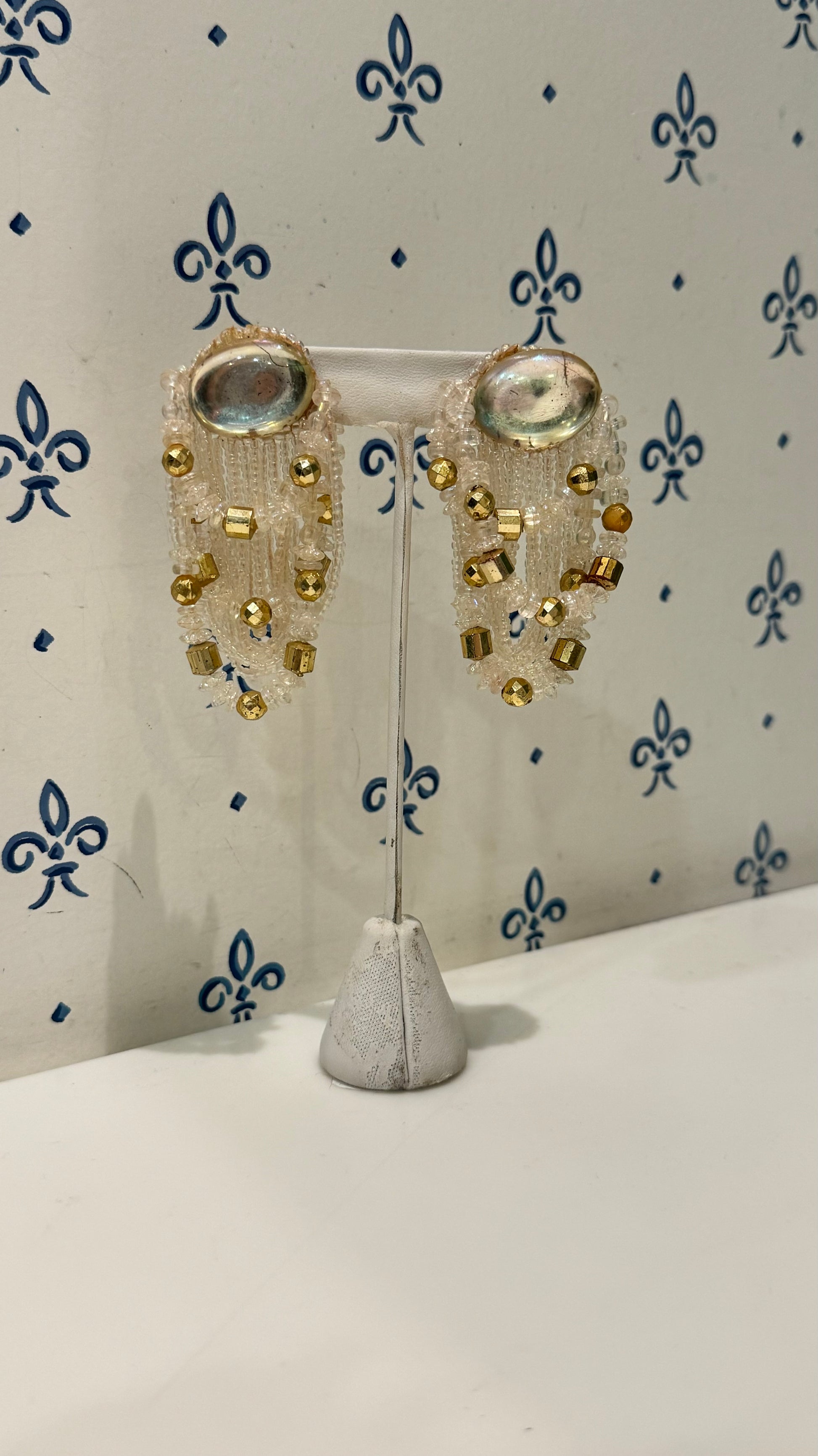 These artisan-crafted, vintage-inspired statement earrings feature a vertical cascade of draped white beads, attached to a horizontal oval cabochon post, evoking the fashion trends of the 1980s.